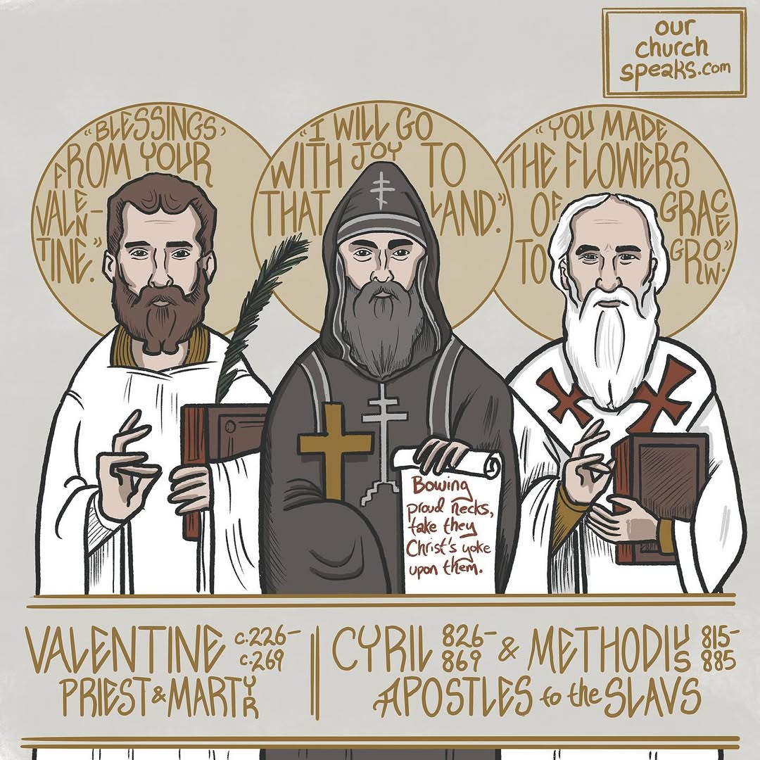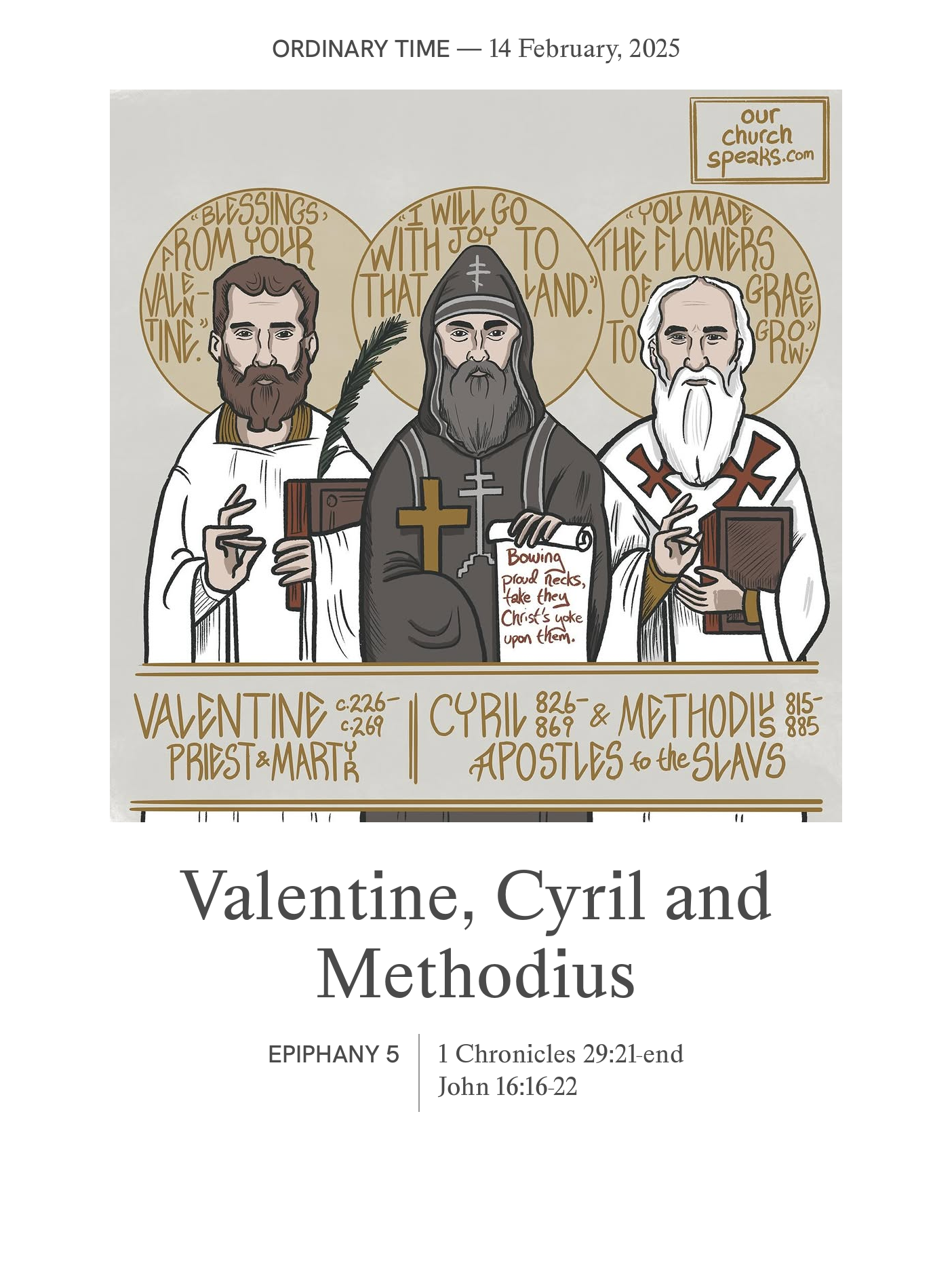 Today we celebrate the feast of Saints Cyril and Methodius, brothers who devoted their lives to spreading the Gospel and creating a written language for the Slavic peoples. Their dedication mirrors the readings today: Solomon's reign brings unity and joy to Israel, while Jesus promises that sorrow will be transformed into joy. Just as Solomon was anointed to lead with wisdom, Cyril and Methodius were called to enlighten hearts through their missionary work. In this Ordinary Time, we are reminded that Christ's presence in our lives can turn our moments of sorrow into profound joy.