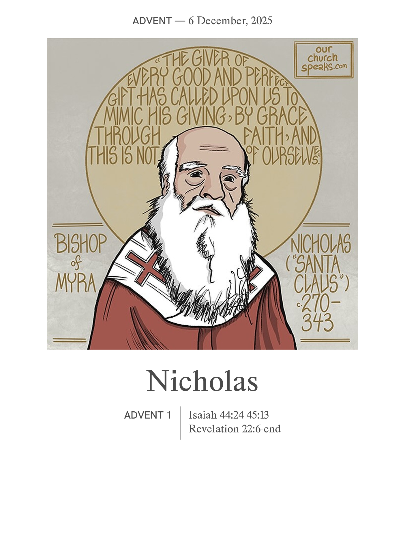 Today, we celebrate St. Nicholas, the beloved bishop known for his generosity and compassion, embodying the spirit of giving during this Advent season. The readings remind us of God's promise to redeem and restore, echoing the essence of Nicholas's life as he brought hope and joy to many. As we await the coming of Christ, we are called to reflect on how our actions can mirror the love and kindness of St. Nicholas, particularly in this time of preparation and anticipation for Christ's birth.